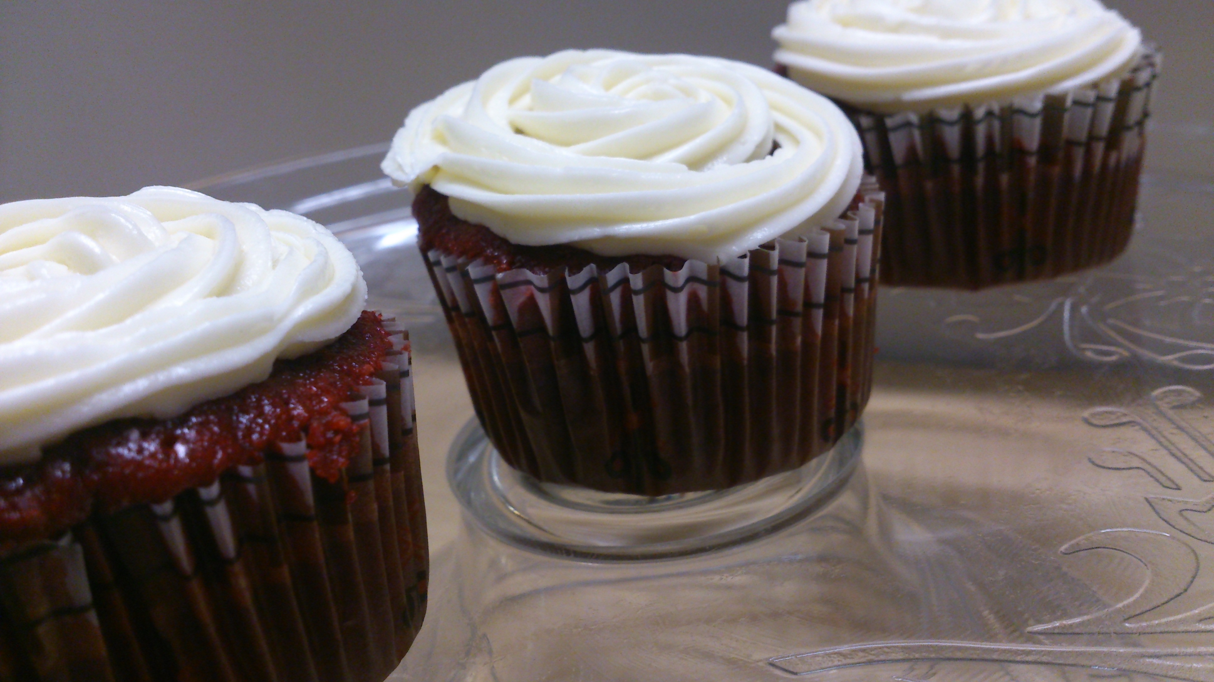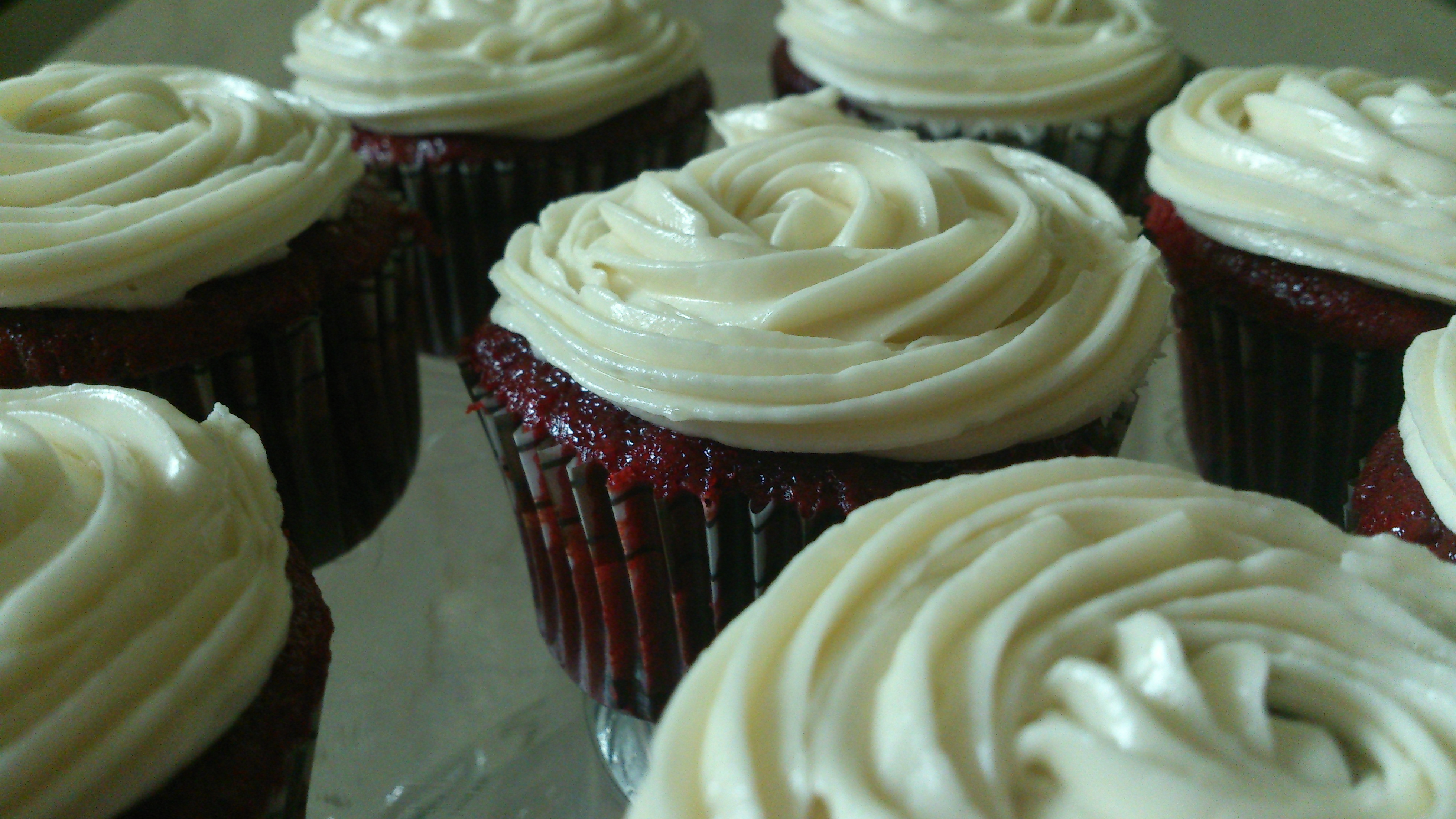 Preheat oven to 180 degree celsius. Line muffin pans with paper liners. In a medium bowl combine flour,sugar, baking soda, cocoa powder and salt, whisk to blend. In another bowl combine eggs, vegetable oil, buttermilk, red food colouring and white vinegar and beat on medium speed using an electric mixer for about a minute. Add dry ingredients and mix on low speed for about 2 minutes. Pour batter into paper liners and bake for about 18 minutes or until a toothpick inserted in the centre comes out clean. Don’t forget to rotate the pans halfway through the baking time. Let cool in pans for 5-10 minutes. Shift to wire rack and cool completely before frosting.