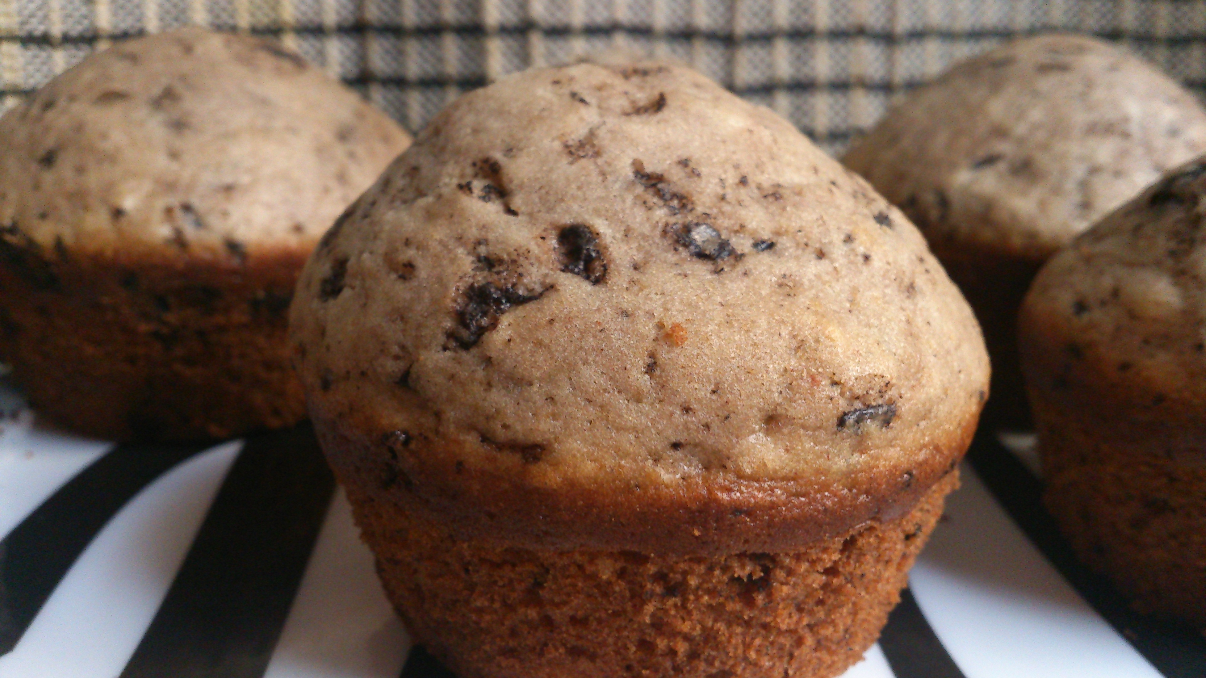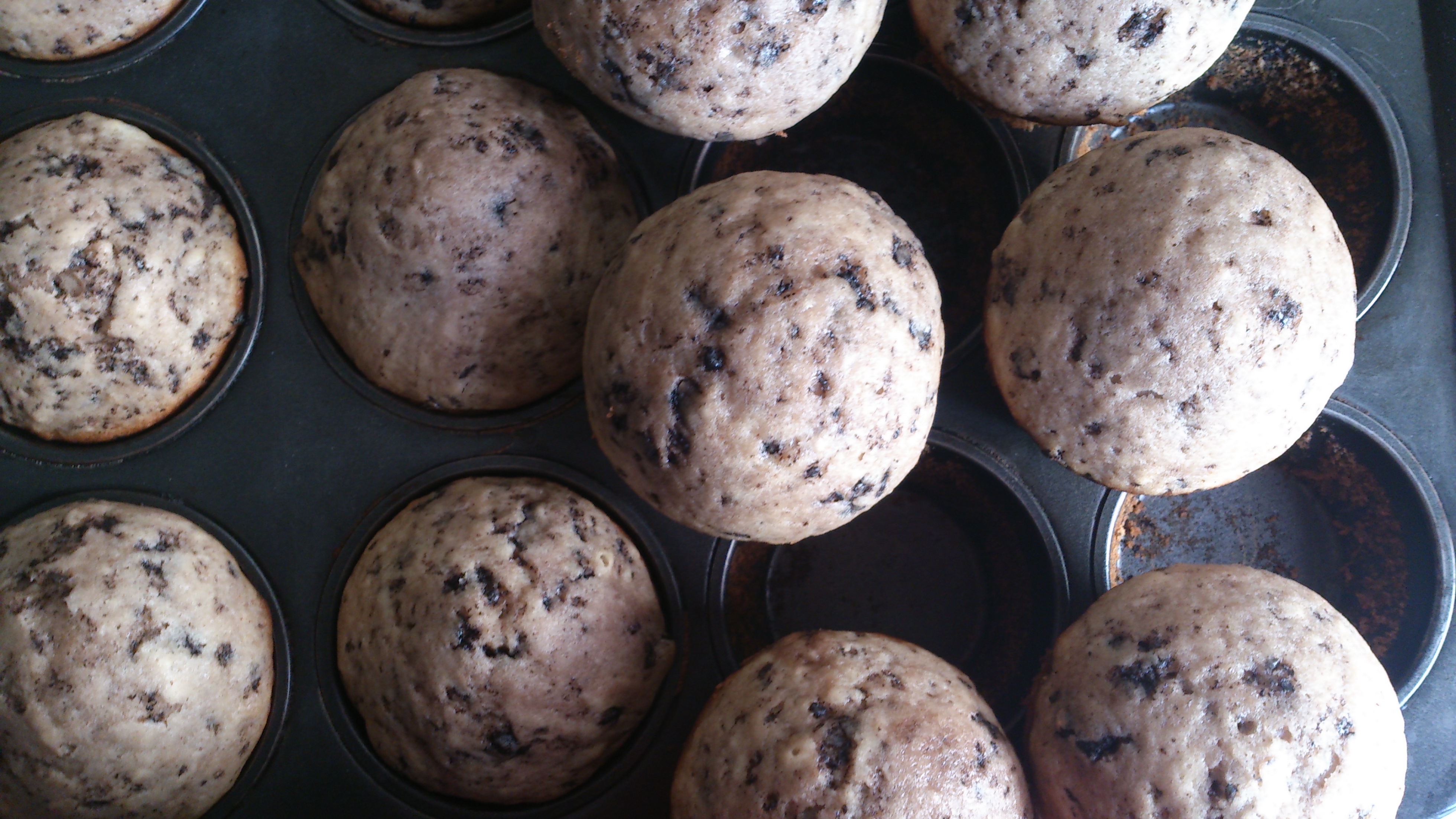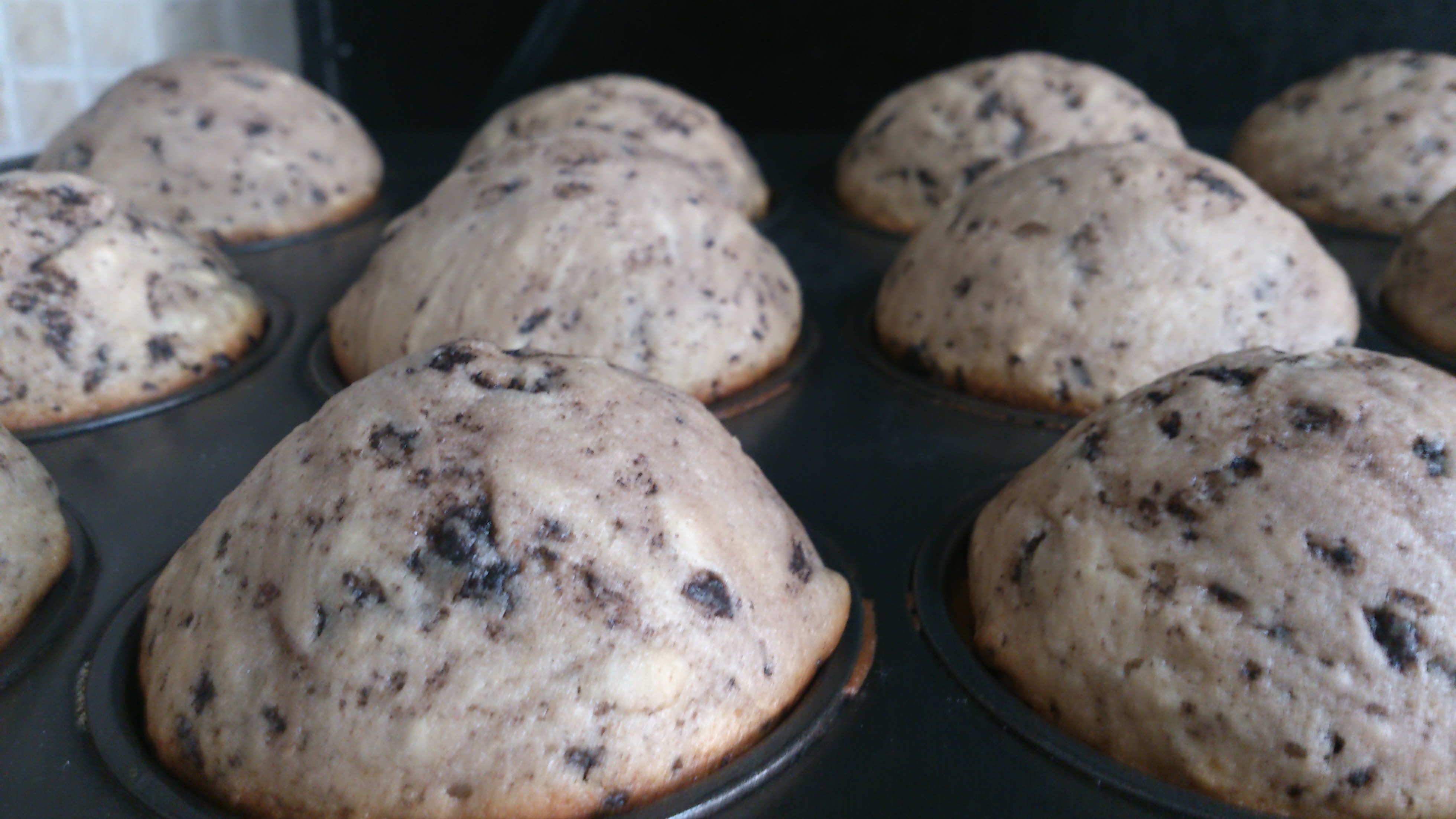 Combine flour, baking powder, salt, cinnamon and nutmeg in a medium bowl and mix well. Whisk eggs and sugar together. Pour buttermilk/milk, oil and vanilla into egg sugar mixture. Fold wet ingredients into flour mixture. Fold in chocolate chips. The batter will will be very thick and somewhat lumpy but do not over mix otherwise muffins would become tough. Fill the muffin holes all the way to the top with the batter. Bake at 425 F/220 C for 5 minutes then reduce to 375 F/ 190 C and bake for further 18-19 minutes until the tops are lightly golden. Let the muffins cool 15-20 before removing from the pan. Transfer to wire rack and cool completely.