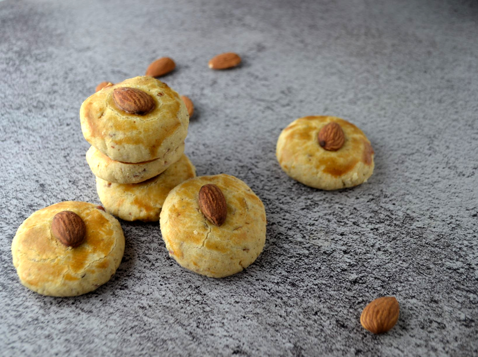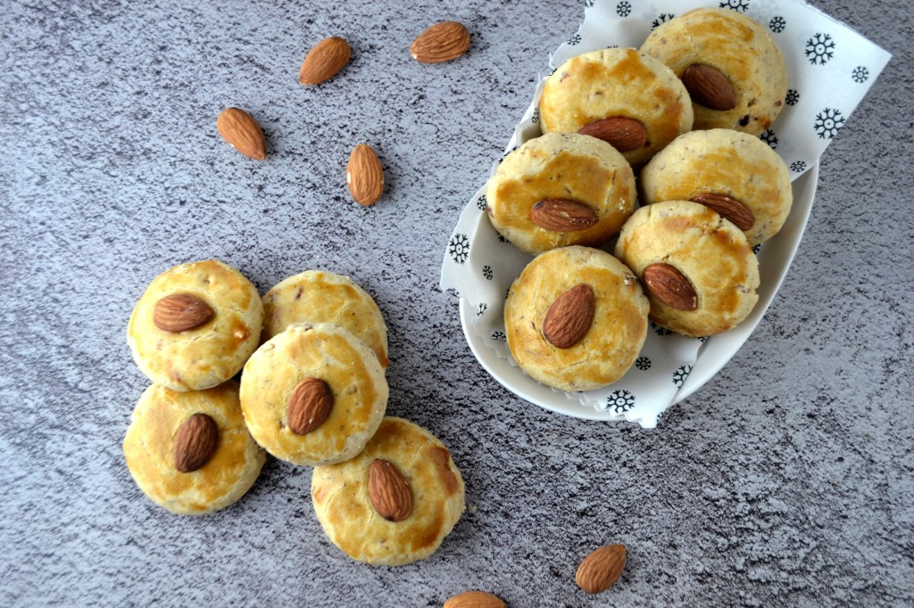 - Place an almond on each khatai and press gently. (This is optional)