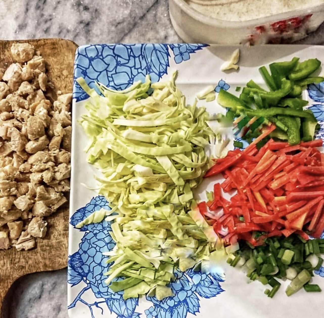 - Add in carrots, cabbage, capsicum and scallions. Stir.