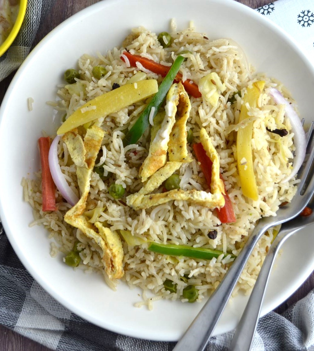 Since it is a rice based dish, the quality of rice matters the most. Basmati rice is my personal favorite and prefer using a packed brand to get consistent results. The reason I am mentioning rice is to stress on quality plus a reminder that different brands of rice may turn out slightly different or may or may not require some adjustment in cooking duration. Just like most rice based dishes, ghee would be ideal to lift and enhance other flavors while keeping rice from clumping. I use desi ghee but it is a matter of preference so feel free to use any cooking oil that you like. Vegetables are the highlight of this delicious pulao. Mostly used vegetables for this pulao are potato, carrot, pea, capsicum, cabbage and onion. Vegetables can be cut in any shape and size and I cut them in bigger pieces because they will be first boiled in water and will cook further with rice when rice are added to the boiling water. Chunkier vegetables would retain their shape, color and flavor better. One thing that I particularly liked about this pulao is the layering of texture which is my favorite element in meal prep. It is quite interesting how a balance of soft and slight crunch is created in this recipe. While most vegetables are softened, shredded cabbage and sliced onion is added when pulao is switched to simmer. Genius! This keeps cabbage and onion a little firm with slight crunch. Plain omelet is used as garnish.